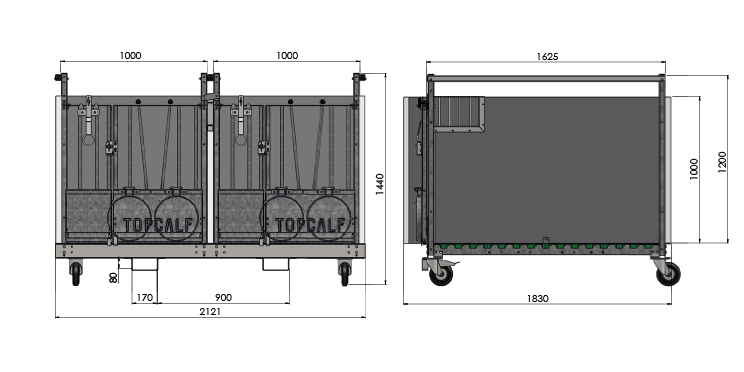 Topcalf Duo XL Flex kalveboks er lavet til to kalve. Som alle Topcalf-kalvebokse har Duo-kalveboksen todelte døre, så man kan gå ind i en kalveboks uden at forstyrre en drikkende kalv. Også i denne kalveboks ligger kalven over nivaeu på et plastspaltegulv. Det betyder, at kalven aldrig ligger på en kold og/eller våd overflade.